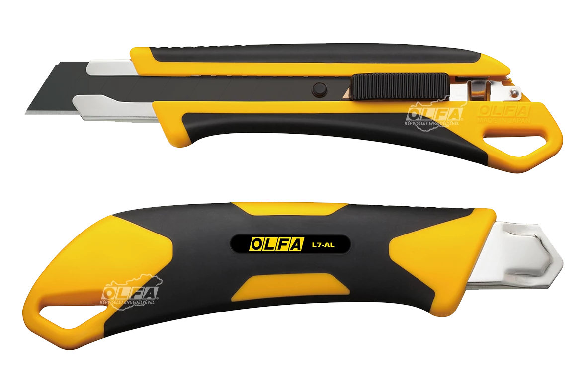 OLFA L7-AL - 18mm-es standard kés / sniccer. Az X Design sorozat nagy igénybevételre tervezett automata pengerögzítésű tagja. Kényelmes és biztonságos fogású markolata elasztomer és megerősített polipropilén anyagból készült. Sav és acetonálló. A markolat végén található nagyméretű nyílásba, biztonsági szerszám heveder csatolható.