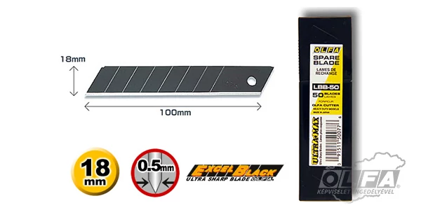 OLFA LBB-50 - 18mm-es keskenyebb élszögű edzett tördelhető penge. A következő standard késekhez alkalmazható: SL-1, BN-L, BN-AL, ML, L-1/green, L-2, XL-2, L-5, L5-AL, L-7, L7-AL, OL, NOL-1, NL-AL, PL-1, CL és CMP-2.